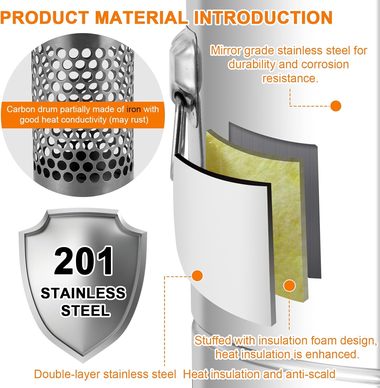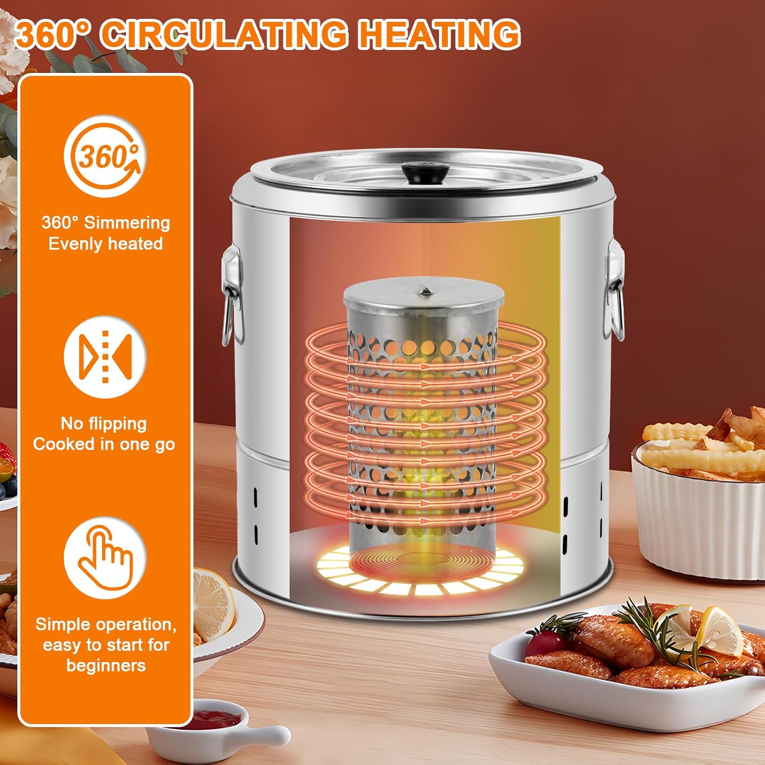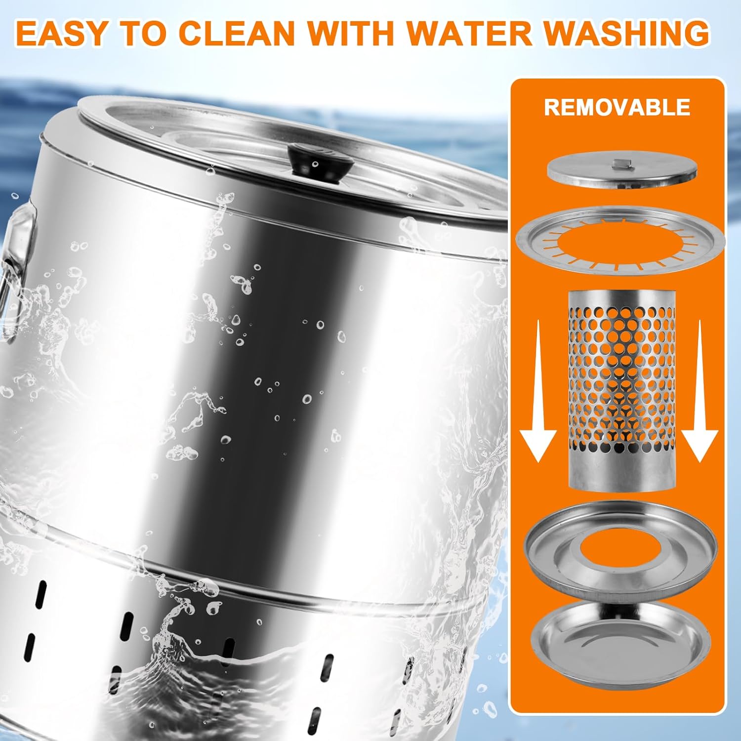 Fabricado em aço inoxidável alimentar duplo e reforçado, resistente a altas temperaturas e à corrosão. Mantém a temperatura interna estável e evita superaquecimento externo. Economiza carvão e acelera o tempo de cozimento.